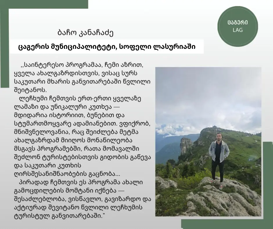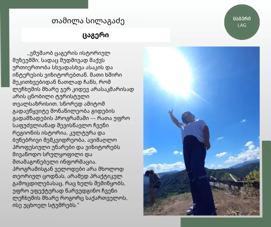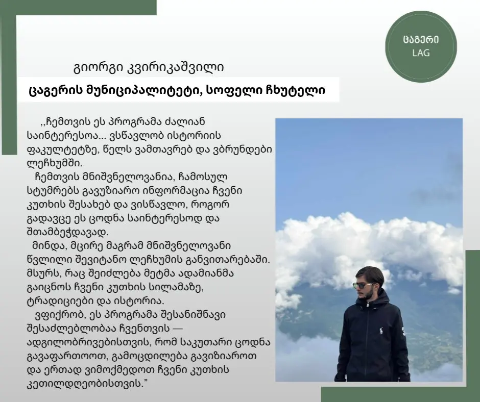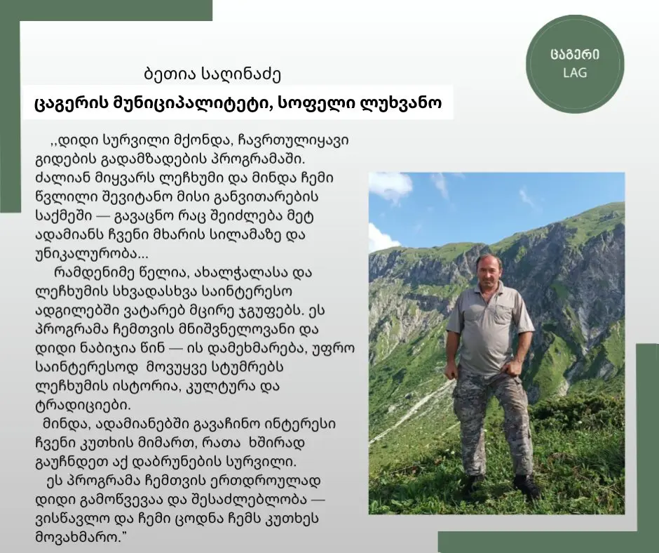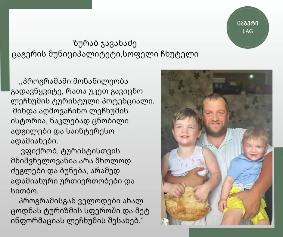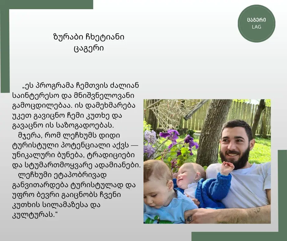 პროგრამაში მონაწილეობენ ადამიანები ლეჩხუმის სხვადასხვა სოფლიდან — ისინი ასაკით, გამოცდილებითა და ისტორიებით განსხვავდებიან, თუმცა ყველას აერთიანებს ერთი მიზანი: სურვილი, უკეთ გაეცნონ საკუთარ კუთხეს და ლეჩხუმის სილამაზე სხვებსაც გააცნონ.