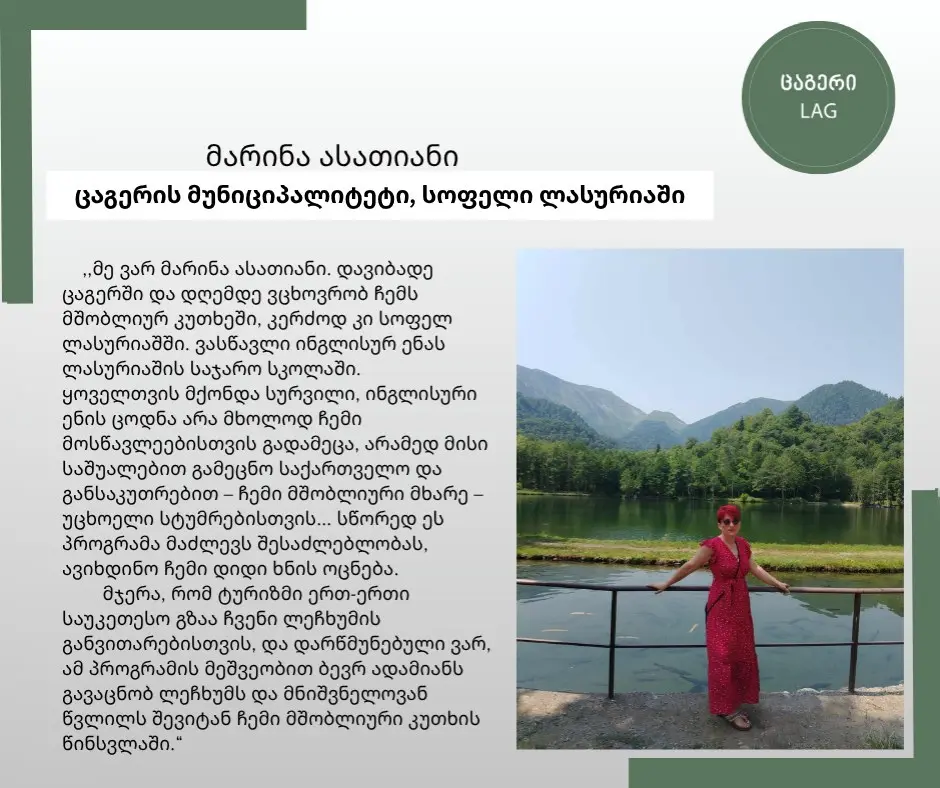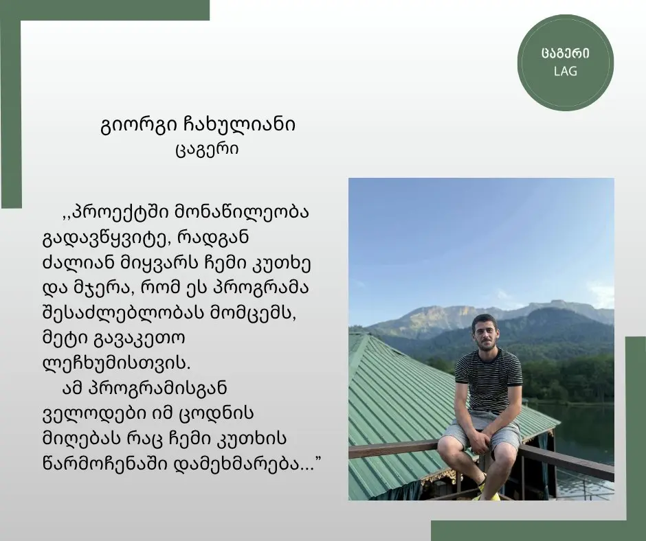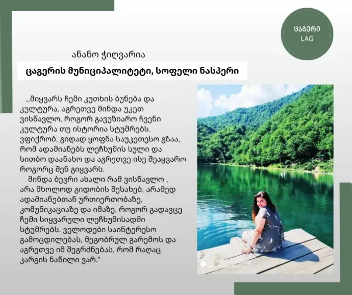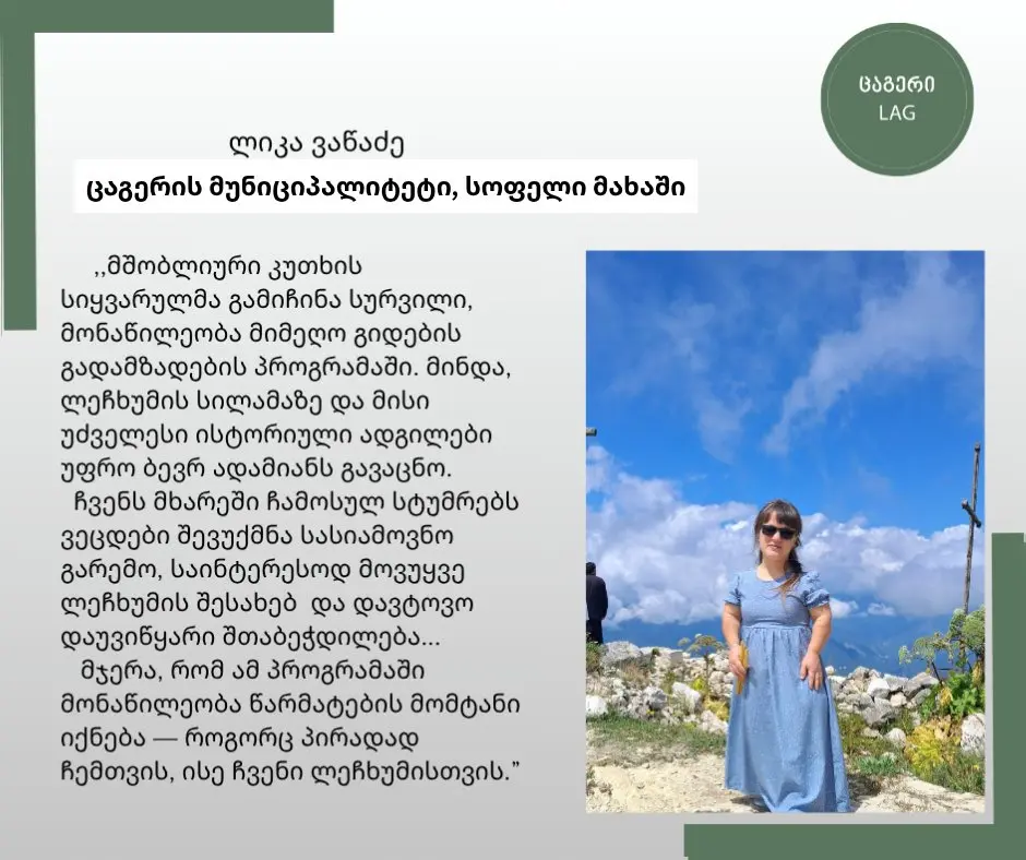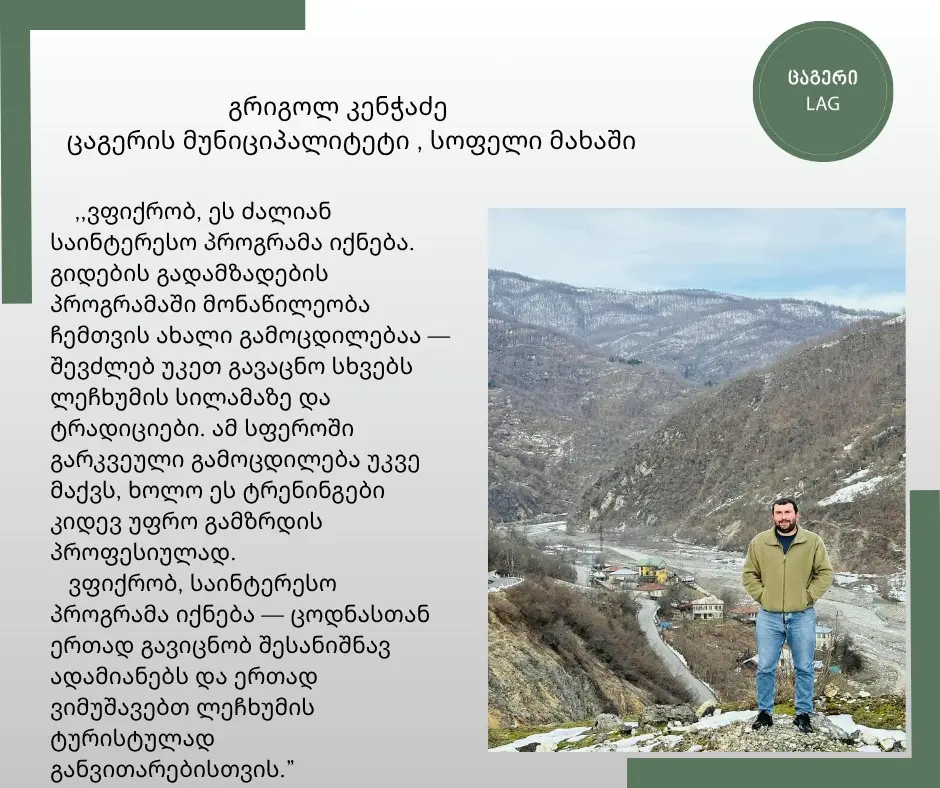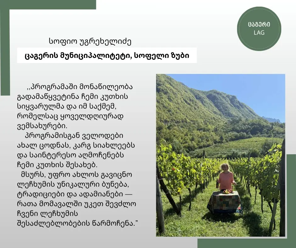 პროგრამაში მონაწილეობენ ადამიანები ლეჩხუმის სხვადასხვა სოფლიდან — ისინი ასაკით, გამოცდილებითა და ისტორიებით განსხვავდებიან, თუმცა ყველას აერთიანებს ერთი მიზანი: სურვილი, უკეთ გაეცნონ საკუთარ კუთხეს და ლეჩხუმის სილამაზე სხვებსაც გააცნონ.